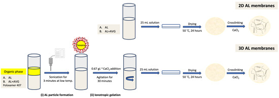 Two different AL membranes were prepared: (i) a two-dimensional (2D) membrane prepared from an AL solution and (ii) a three-dimensional (3D) membrane prepared from an AL nanoemulsion. A comparative evaluation was carried out to determine the structural features of each of the AL membranes. All membranes were prepared with an AL solution of 1% (w/v) using a casting and solvent evaporation technique previously published [52,53,54]. A sonication process was first carried out to obtain the 3D AL membranes. AL or AL-AVG solutions were subjected to high-intensity ultrasonication for 3 min, controlling the temperature with an ice bath (7–10 °C) [31]. Hexane was used as an organic phase to produce the nanoemulsions, and 0.5% poloxamer-407 was used as a stabilizer. After ultrasonication, the ionotropic gelation was achieved by adding a 0.67 g/L CaCl2 solution to the resulting emulsion under magnetic agitation for 30 min. In the production of AL-AVG membranes, pasteurized AVG solution was incorporated due to its high antioxidant activity. A schematic process for the 2D and 3D membrane production is presented in Figure 10. The physicochemical analysis of the AL and AL-AVG nanoparticles in the emulsions was carried out by measuring the particle size and polydispersity, and the zeta potential was determined using a Zetasizer Nano series (Malvern Instruments Inc., Worcester, UK). Appropriate dilution of the emulsion of nanoparticles was performed with ultrapure water. All measurements were repeated at least three times, and the average values are presented.
