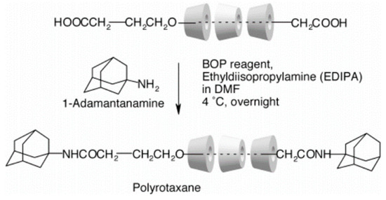 - Araki, J.; Zhao, C.; Ito, K. Efficient production of polyrotaxanes from α-cyclodextrin and poly (ethylene glycol). Macromolecules 2005, 38, 7524–7527. [Google Scholar] [CrossRef]