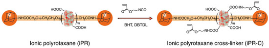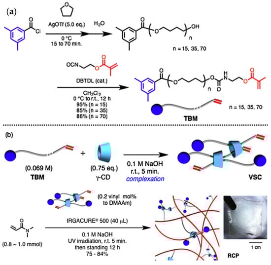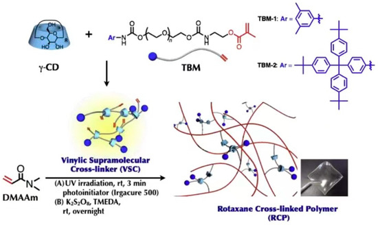 Compared with α-CD and β-CD, γ-CD has the biggest cavity size. It may cause the two chain molecules to pass through one cavity or the solution molecules to enter the cavity, which give the material properties different from those of α-CD and β-CD [53]. Jang et al. [54] reported that γ-CD was used to prepare the polyrotaxane cross-linking agent. The extremities of the long-chain molecule were plugged with terminal bulky end tethering PEG macromonomer (TBM) or 4-(Tris(4-tertbutylphenyl) methyl) phenyl isocyanate, as shown in Figure 13. Mix TBM dissolved on polytetrahydrofuran (PTHF) with γ-CD in NaOH solvent and react fully to obtain a γ-CD vinyl supramolecule cross-linking agent (VSC). Then, copolymerize VSC with N, N-Dimethylacrylamide (DMAAm) to obtain a polyrotaxane cross-linked polymer (RCP) based on γ-CD. Comparing the swelling property with a conventionally cross-linked polymer (CCP) based on PEGDA cross-linking agent, it was found that the swelling rate increased from 500% to 1800% in water and from 1000% to 2400% in DMF solution. According to the results of viscoelastic property at 15% water content, all the SeS curves of two kinds of hydrogels showed yielding and plastic deformation, which indicated the typical glassy polymer films. The CCP had a pressure peak of 5 MPa, and the RCP reached a peak of 27 MPa. Furthermore, the effect of the length of PTHF on γ-CD polyrotaxane polymer was investigated, and the results showed that γ-CD polyrotaxane polymers made from VSCs with longer PTHF chains were more ductile, indicating that the movement range of the cross-linking points directly affected the mechanical properties of the γ-CD polyrotaxane polymer. Compared with the covalent crosslinked polymer, the γ-CD polyrotaxane polymer had a better swelling property. Subsequently, Iijima et al. [55] prepared TBM by cationic ring-opening polymerization of tetrahydrofuran with 3,5-dimethylbenzoyl chloride (initiator and plugging agent), silver trifluoromethanesulfonate, and isocyanate methacrylate. γ-CD was reacted with TBM to obtain VSC, and then VSC was copolymerized with DMAAm to obtain a γ-CD polyrotaxane polymer, as shown in Figure 14.