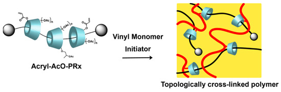 The idea of Harada’s group [29] was similar to Imran. They are experienced in utilizing α-CD to react with propylene oxide. Then, the carbon–carbon double bonds were introduced by reacting with acryloyl chloride. Finally, modified α-CD reacted with acetic anhydride to obtain α-CD polyrotaxane cross-linking agent. It copolymerized with ethyl acrylate or butyl acrylate to obtain a hydrogel, and the preparation process of the topologically crosslinked polymer is shown in Figure 6. Compared with the stress–strain curve, the strain at break of the new hydrogel material was up to about 600%, which was much higher than the conventional chemical hydrogel material. During the tensile deformation test, the conventional chemical hydrogel broke before reaching plastic deformation, whereas the new hydrogel dispersed the stress through a sliding structure and had an average recovery rate of 74% between healing intervals.