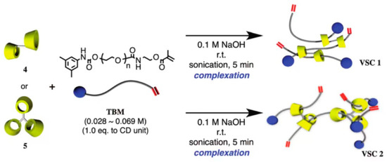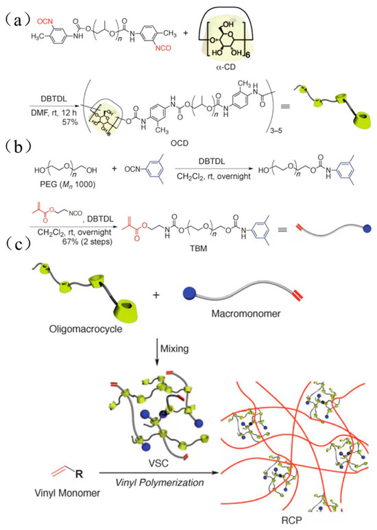 The bulky molecules were regarded as the plugging agent in the previous method. Although it prevented CDs from sliding from the long-chain molecules, the preparation process was cumbersome, and the productivity was low. Some researchers utilized α-CD polymers to react with PEG methacrylates (TBM) to obtain an α-CD polyrotaxane cross-linking agent. One of the extremities was plugged with bulky groups, and another one contained carbon–carbon double bonds, which could react with monomers to plug the extremity through polymerization. Although the method could reduce the preparation steps, it might cause CD to fall out from the long-chain molecule. Arai et al. [34] reported the preparation of a polyrotaxane cross-linking agent, and the process is shown in Figure 7. First, toluene diisocyanate (TDI) plugged with polypropylene glycol reacted with dibutyltin dilaurate (DBTDL) and α-CD to obtain oligomeric CD (OCD). Then, the macromolecular monomers based on hydroxyl-plugged PEG reacted with 5-dimethylphenyl isocyanate to prepare TBM. Finally, OCD was mixed with TBM, and an α-CD polyrotaxane cross-linking agent (VSC) was obtained. VSC reacted with photoinitiators and vinyl monomers, and then the mixture was degassed and irradiated with UV at room temperature for 3 min to obtain hydrogel materials. Alternatively, VSC reacted with vinyl monomer and degassed, then N, N, N′, N′-tetramethylethylenediamine (TMEDA), and potassium persulfate (KPS) were added to the mixture and reacted overnight at room temperature to obtain the hydrogel material. Finally, the hydrogel was dried in an oven at 60 °C for 1 day to purify the rotaxane cross-linked polymer (RCP). The new hydrogel showed a great swelling property (ηSwelling > 1800%) in the different liquid solutions, such as water, methanol, THF, etc. Compared with hydrogel based on polyethylene glycol diacrylate (molecule weight 400) as the cross-linking agent, the elongation at break was improved from 880% to 1210% at a low cross-linking degree and from 310% to 790% at a high cross-linking degree. Sawada et al. [35] reported a rotaxane cross-linking agent based on crown ether and prepared an elastomer with high toughness. A method was reported by Iijima et al. [36] for the preparation of α-CD polyrotaxane cross-linking agent based on α-CD dimers or α-CD trimers, using the reaction of α-CD dimers or α-CD trimers with TBM to obtain VSCs, and the preparation process is shown in Figure 8.