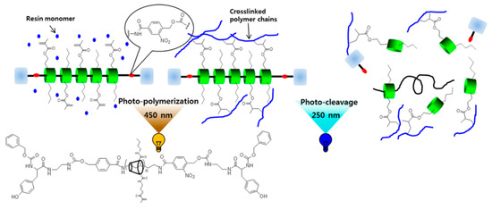 The materials synthesized from α-CD polyrotaxane cross-linking agent prepared by the above two methods had a “slide-ring” effect. Seo et al. [37] reported a photocurable plastic based on α-CD polyrotaxane cross-linking agent with degradable characteristics, and the preparation process is shown in Figure 9. Carbonyldiimidazole (CDI) allowed the hydroxyl groups of the α-CD to be modified by n-butyl groups. Each one of α-CD contained 13 n-butyl groups, and the substitution of hydroxyl groups of α-CD could be adjusted by controlling the addition of CDI. The n-butyl-containing α-CD polyrotaxanes were modified with 2-aminoethyl methacrylate, so the cross-linkable acrylic acid groups were introduced to the α-CD polyrotaxanes. Light-curing plastics were successfully prepared by copolymerizing α-CD polyrotaxane cross-linking agent with hydroxyethyl methacrylate (HEMA) and urethane (UDMA). Dithiothreitol (DTT) was used to treat the light-curing plastic, resulting in the Vickers hardness of the light-curing plastic decreasing, indicating that an α-CD polyrotaxane cross-linking agent could be used to design and prepare the degradable light-curing plastics. The cleavable plugging groups (disulfide group) were introduced to the extremities of α-CD polyrotaxanes. The cleavage reaction was triggered by the stimulation of DTT, resulting in the structural decomposition of the α-CD polyrotaxanes and the release of α-CD molecules. Furthermore, Seo et al. [38] treated α-CD as the cross-linking agent to react with n-butyl and methacrylate to obtain the new resin with a “slide-ring” structure, and then the photodegradable o-nitrobenzyl compounds plugged the extremities, as shown in Figure 10. The ultimate tensile strength of the resin decreased to 40% of the initial value with 254 nm UV irradiated.