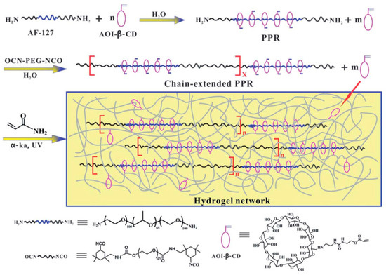 Cui et al. [48] used 2-isocyanatoethyl acrylate (AOI) to modify β-CD. PEG-PPG-PEG was added to the mixture and stirred fully to make sure the long-chain molecule passed through the cavity of β-CD. Then, isocyanate groups were employed to plug the extremities of PEG to obtain a new hydrogel, as shown in Figure 12. The hydrogel stretched from 10 to more than 26 times its original length and withstood 95% or even 98% of the compressive strain without breaking.