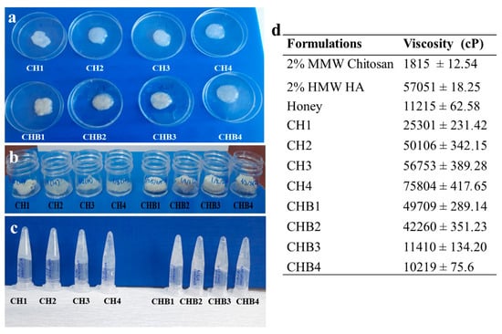 The chitosan/HA/honey formulations were visually examined for their color, integrity, and homogeneity (Figure 1a). It was observed that hydrogels have an opaque and homogeneous structure. Hydrogel-loaded eppendorf tubes were turned upside down to observe their flow against gravity. All formulations except CHB4, with the highest honey content, remained steady against gravity. CH3 and CHB3 formulations were ideal in terms of color, integrity, homogeneity, and spreadability (Figure 1c).