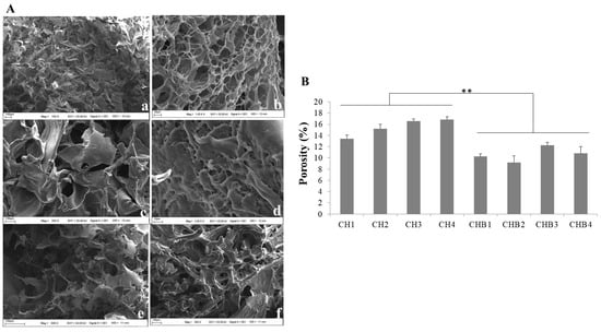 (A). SEM images of hydrogels. (a). Hyaluronic acid (b). Chitosan, (c). CH1, (d). CHB1, (e). CH3, (f). CHB3 hidrojelleri, (B). Porosity determination of CH and CHB formulations (** p = 0.002).