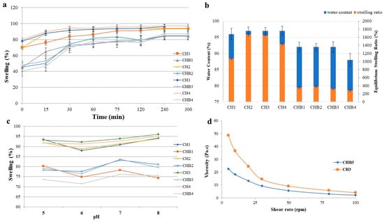 (a). % swelling ratios of hydrogels; (b). % water content and equilibrium swelling ratio; (c). % swelling ratios of hydrogels at different pHs; (d). Rheologic properties of CH3 and CHB3 formulations.