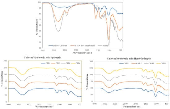 FTIR spectroscopy was performed for the identification of intermolecular interactions in chitosan/HA and chitosan/HA/honey hydrogels (Figure 4). Functional groups of MMW chitosan, HMW HA, and coacervate hydrogels are characterized. The characteristic peaks of chitosan were in the amide I band at 1647 cm−1, -NH2 bending vibrations at 1595 cm−1, and the amide III band at 1377 cm−1. The characteristic peak of hyaluronic acid is the C=O stretching vibration at 1640 cm−1 due to the carbonyl group. In chitosan/HA hydrogel formation, -NH2 bending vibrations at 1595 cm−1, an amide III band at 1377 cm−1 of chitosan, and C=O peaks at 1640 cm−1 of HA were observed. The characteristic peaks of honey (caused by glucose and fructose) are C-H and C=O, with C-O stretching bands at 2910 cm−1,1650 cm−1, and 1054 cm−1, respectively. The broad band at 3300 cm−1 comprises O-H stretching vibrations caused by sugars bonded with water. The FTIR spectrum of honey-containing formulations revealed band profiles similar to the spectrum of honey.