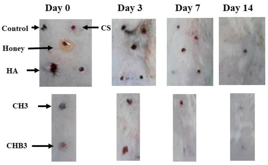After general anesthesia, the back hair of the rats was shaved and wiped with povidone. A full-thickness wound (containing the epidermis and dermis) using a biopsy instrument with a 6 mm diameter was inflicted on each side of the animals’ dorsal region. The rats were divided into five groups, with six rats in each group: control (saline), chitosan, honey, HA, chitosan/HA (1/2, CH3), and chitosan/HA/honey (1/2/2, CHB3) hydrogel groups. After wound formation, hydrogels and honey were applied to the wounds every three days. The wound healing effect of chitosan/HA/honey hydrogels was measured histopathologically on days 7, 14, and 21. A piece of skin up to the muscle layer covering the wound and an area of 5–10 mm2 from the uninjured part around the wound were removed. Afterwards, a histopathological examination of skin tissues was performed. The effects of the formulations on wound healing were evaluated by examining parameters such as inflammatory cells, fibroblasts, epithelial migration, re-epithelialization, new capillary formation, and collagen fiber deposition [].