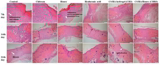 The process of wound healing is a multifaceted and systematically ordered phenomenon that involves several stages, including homeostasis, inflammation, cell migration and proliferation, and remodeling []. Macroscopic analysis of wound healing was shown in Figure 6. It was observed that CS/HA/Honey hydrogel application accelerated wound healing on the 7th day more than other groups. Complete closure of the wound occurred on the 21st day in all groups. Histopathological examinations were performed on days 7, 14, and 21 to evaluate the wound healing process (Figure 7). Interactions between keratinocytes and other cell types during wound healing are essential for complete wound closure. An imbalance in cellular or molecular mechanisms leads to fibrosis []. In our study, cellular content was found to be high in the groups where honey and honey-containing hydrogels were applied (Figure 7). Honey influences cellular responses such as cell migration and proliferation, collagen matrix production, and the chemotaxis of keratinocytes, fibroblasts, and endothelial cells. Therefore, honey may accelerate wound closure with re-epithelialization []. Chitosan has been shown to increase cell migration and cellular content in honey-containing wound care formulations [].