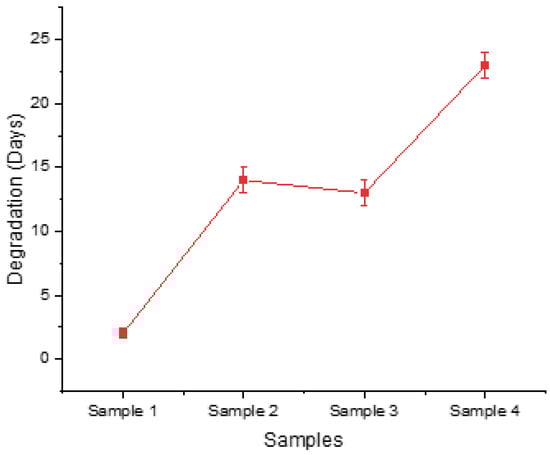In the proposed methodology, an initial screening stage was incorporated consisting of experiments to evaluate the effectiveness of the levels chosen for the RSM DoE. Aiming to determine whether these selected levels warranted further optimization, a total of four samples were prepared. These samples encompassed various combinations of factors at different levels: Sample 1 involved the low-level combination of factors, Samples 2 and 3 represented medium-level combinations, and, finally, Sample 4 encompassed the high-level combination of factors. A detailed breakdown of these combinations can be found in Table 14. The samples were then evaluated in terms of degradation rate and swelling ratio.