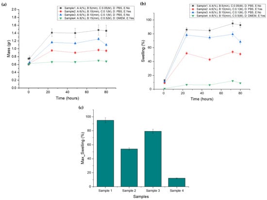 (a) Screening samples’ mass plot after immersion in culture media, (b) screening samples’ swelling curve after immersion in culture media, (c) maximum swelling ratio for each screening sample.
