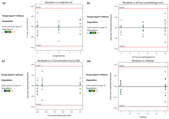 Furthermore, in order to identify any patterns and outliers in the residuals associated with different factor levels or combinations, the Residuals vs. Factor plots were studied. The horizontal axis of the plots in Figure 4 represents the factors that were identified as significant and their levels. As shown in the colored dot plots (Figure 4a–c), the samples that maintained their structural integrity for more days when immersed in the culture medium (marked as red points) were those that were treated with the maximum levels of the three statistically significant numerical factors. In addition, the degradation time was maximized when the samples were immersed in DMEM instead of PBS, as shown in Figure 4d. The fact that the residuals fall between the two horizontal red lines suggests that the residuals have a relatively uniform variability and are evenly distributed around zero, and that the patterns in the data are sufficiently captured.