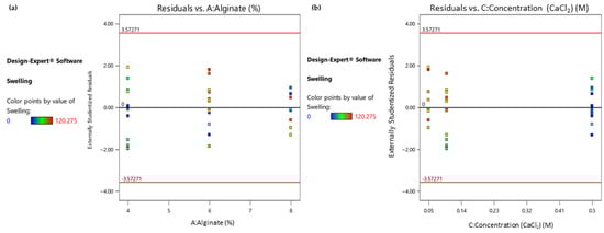 As depicted in the colored dot plot (Figure 5), when studying the statistically significant factors separately, it can be deduced that the samples exhibiting a moderate swelling ratio (marked as green points) are those that had lower levels of their alginate ratio (Figure 5a) or those which were treated with a higher-level concentration of CaCl2. Moreover, both diagrams are indicators of a uniform variability and even distribution.