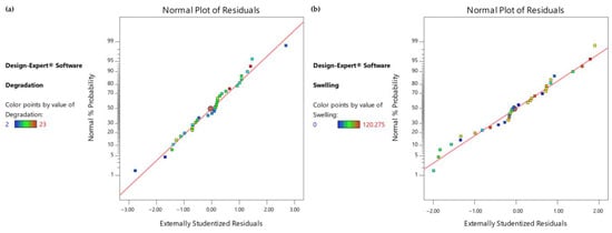 In order to validate the obtained models and predicted optimal values, a parallel analysis in Minitab 2021 was conducted utilizing the levels’ configuration generated by the RSM design, along with the corresponding results for the degradation and swelling ratio. The results of this analysis in Minitab 2021totally mirrored those obtained in Design Expert (DE). Specifically, the same terms and interactions were identified as statistically significant for both the degradation and swelling ratios, as presented in Figure 11a,b respectively. Moreover, regarding the generated models’ analysis of variance as well as the models’ summary, the calculated values are identical to those obtained from DE as presented in Table 10, describing the observed data effectively. Moreover, the desirability score was again calculated as 0.963, affirming that the validation test confirmed the existence of a solution that optimizes both responses without significant compromise. Notably, as shown in Figure 12, all of the predicted optimal levels are completely identical with those obtained from DE. Thus, the results obtained from this validation approach completely align with the outcomes obtained using Design Expert, further reinforcing the accuracy of the software and models used in the study.
