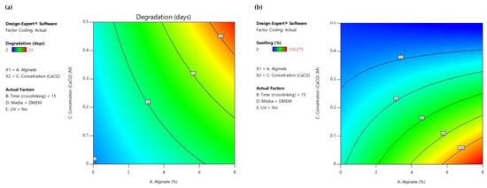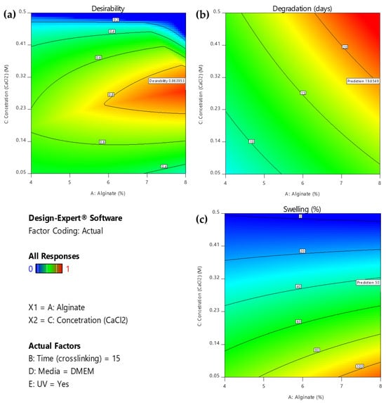 Furthermore, the slope of these lines demonstrates the magnitude of a variable’s impact on the response; a steeper slope signifies a more pronounced effect. As is comprehensively presented, the optimization’s objective can be reached by using a high alginate ratio for a high level of immersion time in the medium crosslinker concentration. In regard to the conditions, UV exposure is suggested. Immersing the scaffolds in PBS might negatively affect the degradation rate of the scaffold. These results are also verified by the 2D contour plots (Figure 10), where the highest desirability is observed (contoured as red region) for high alginate ratios and medium levels of crosslinker concentration when the immersion time in DMEM is 15 min.