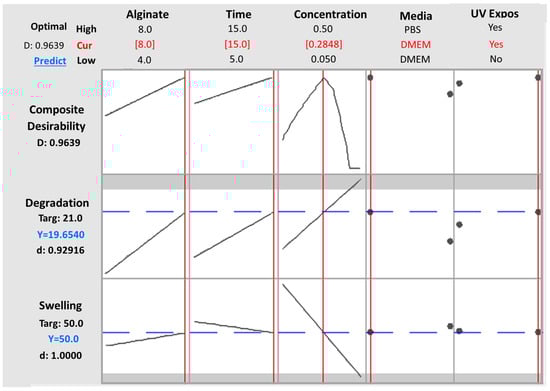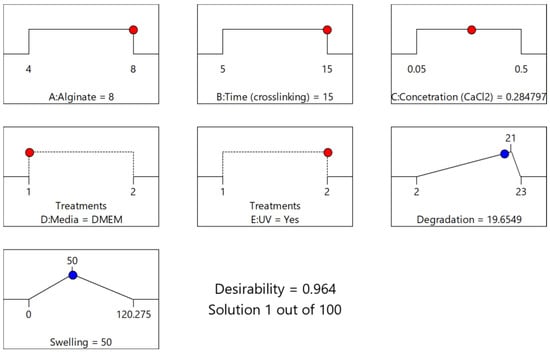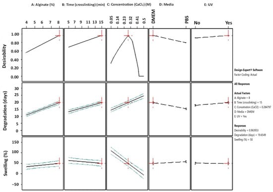 In order to evaluate the equations’ accuracy, a confirmation experiment was piloted selecting the medium levels of the factors: A: alginate ratio = 6%, B: time (crosslinking) = 10 min, C: concentration (CaCl2) = 0.1 M, D: media = DMEM, UV exposure = Yes. The measurements were conducted in triplicate and the average values were obtained for both responses (degradation time and swelling ratio). The results and the comparison with the values predicted by the actual reduced 2FI model equations are presented in Table 8. Both experimental values fall into the Confidence Interval, indicating the equations’ high predictability.