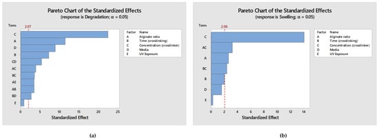 (a) Pareto Chart displaying the terms from the largest effect to the smallest effect on degradation response with a reference line for statistical significance; (b) Pareto Chart displaying the terms from the largest effect to the smallest effect on swelling ratio response with a reference line for statistical significance.