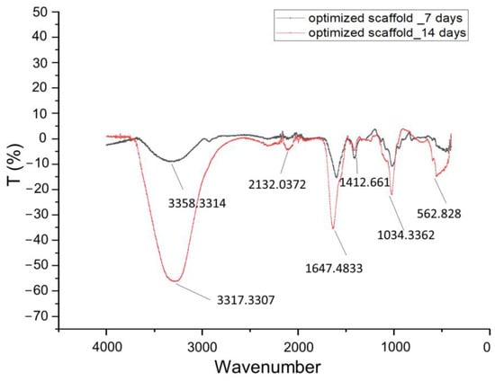 Figure 13 displays the FT-IR spectra of the pellets that were collected after centrifugation of the media in which the optimized scaffold was immersed for 7 days and 14 days, respectively. The wide peak at 3358 is a characteristic peak of sodium alginate for –OH stretching [27]. The stronger peaks at 1034 (Amide III) and 1412 (O-C-C stretching) are indicative of dissolute gelatin and sodium alginate, demonstrating that, on Day 7, the scaffold exhibited lower degradation [29]. The narrow peaks at 3317 and 1647 cm−1, as well as at 562 and 2132 cm−1, are water characteristics, and this might indicate that the pellet was not totally dried. The scaffold was dissolved in the media in 18.5 days, almost reaching the ideal degradation interval of 21 days.