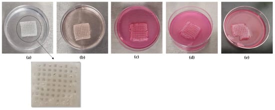 The 3D printing of the scaffolds was accomplished using the Bioprinter Regemat 3D BIO V1 (REGEMAT 3D S.L., Granada, Spain). The composite alginate–gelatin hydrogel inks were loaded into 5 mL syringes. Subsequently, the material was extruded from the syringe nozzle to form a continuous filament, aided by the motor-assisted piston mechanism. The hydrogel filament was deposited layer by layer, following the designed 3D blueprint [22]. The designated scaffold dimensions were specified as L:17 mm × W:17 mm × H:3.5 mm, featuring an infill pattern of orthogonal pores measuring L:1.7 mm × W:1.7 mm. In order to ensure high printability and geometric accuracy, the optimal levels of four primary (Temperature, Extrusion Speed, Nozzle Diameter, Layer Height) and four secondary (Perimeter speed, Infill Speed, Retract Speed, Travel Speed) printing parameters were implemented. These optimal parameter settings had been previously determined through a robust Taguchi design, as detailed in our earlier work on optimizing the 3D printing process. A comprehensive overview of the nine printing parameters and their respective optimal levels can be found in Table 16.