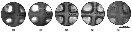 After the development of the three distinct alginate–gelatin ink configurations (4/4 (%), 6/4(%) and 8/4 (%)), the successful Direct Ink Writing of the scaffolds for use in the suggested screening tests was subsequently undertaken. The four samples were printed in triplicate and each of them was then methodically treated in accordance with the specified conditions, as determined by the selected leveling of the post-printing factors, in order to record the variance in the degradation time and swelling ratio results. For the assessment of the scaffolds’ shape fidelity and structural integrity, precise measurements were taken, including their dimensions and the diameter of their individual strands, via ImageJ (National Institutes of Health, Bethesda, MD, USA) software. The term ‘material strand’ refers to the diameter of the deposited material. In this context, it is compared to the theoretical value, which is defined by the tip’s diameter (0.41 mm in this case). This comparison serves to define the printability of the ink based on the following equation (Equation (1)):