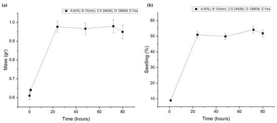 In vitro cell culture studies depend significantly on the scaffolds’ capacity to swell, as this property permits the flow of cell nutrients inside the scaffold, increasing the cell’s longevity. Moreover, a swelling test is critical as it provides an estimate of the scaffolds’ maximum volume following implantation. In this study, the swelling tests were conducted by immersing dry samples in DMEM or PBS at 37 °C. The samples were taken out at various time intervals, they were tapped dry to remove excess water and then weighed until water absorption reached saturation. The following equation was used to determine the swelling ratio of scaffold sample (Equation (2)):