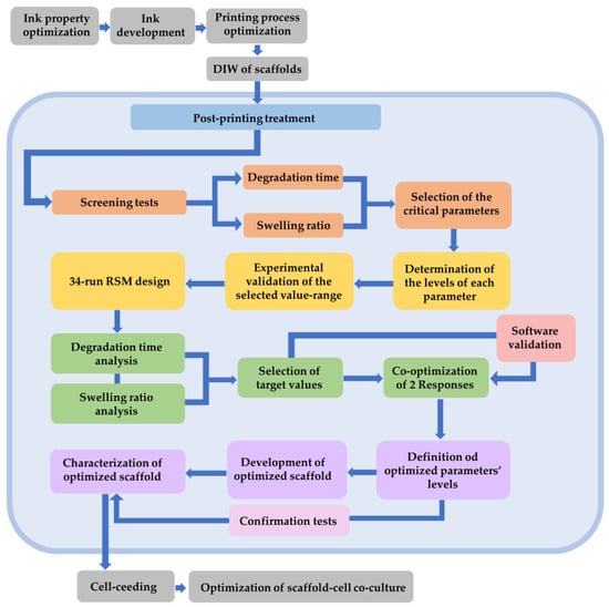 In addition, until now, the state of the art, including our team’s previous work [22], in Direct Ink Writing (DIW) has primarily relied on the Design of Experiments (DoE) to optimize the initial two stages, which encompass the material processability and printing process parameters. There is also a limited number of studies optimizing some scaffold properties, like porosity, based on material composition [23]. Notably, the existing literature lacks any evidence of a similar methodology applied to the subsequent post-printing stage. However, it is imperative to extend the application of the DoE to optimize the post-printing treatment phase, given that it is influenced by numerous factors which are often overlooked (UV treatment, culture media), resulting in inefficient resource utilization through trial-and-error approaches [24]. Furthermore, the implementation of an experimental design becomes crucial to identify the most functional compromise within the 3D system, focusing on key responses such as the degradation behavior and swelling ratio. Such a design would not only illuminate the interactions among the post-printing treatment factors but also expedite the development of a predictive model for enhanced efficiency.