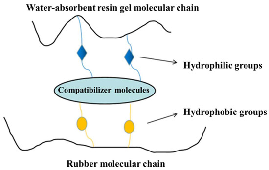 Introducing a compatibilizer during the blending of the rubber and water-absorbent resin gel can increase the thickness of the interface layer between the blend components and strengthen their bonding force to a certain extent. The intermolecular bonding force promotes the combination of two incompatible polymers, thereby yielding a stable blend product, preventing the water-absorbent resin gel from detaching from the rubber and achieving better compatibility.