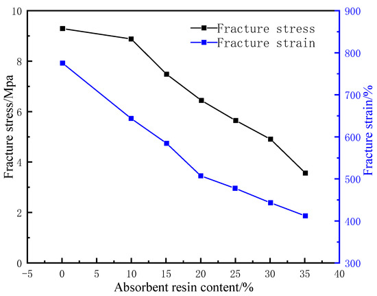 Under fixed concentrations of the other components, with the increase in the water-absorbent resin-gel dosage, the water absorbency of the LCM gradually increased before stabilizing, while the tensile strength and elongation at break showed significant downward trends (Figure 3). This is because the increased initial addition of water-absorbent resin gel resulted in greater water absorption and a higher swelling ratio, putting pressure on the surrounding rubber. The hydrophilic components then formed channels to the external environment, thus, precipitated under the pressure of the rubber, reaching an approximate saturation state. Meanwhile, the excess water-absorbent resin gel was unevenly distributed in the rubber matrix, which caused a stress concentration defect in the resin-gel–rubber expandable LCM blend, leading to a decrease in tensile strength and elongation at the break. To maintain the tensile strength while improving the water absorbency, the water-absorbent resin-gel dosage should be 25%.