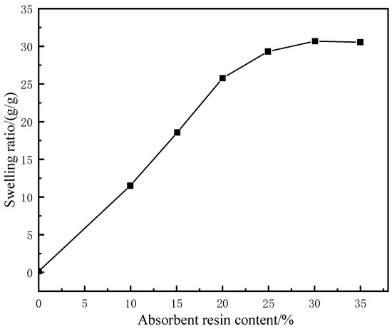 The rubber matrix and compatibilizer were mixed at a ratio of 1:0.2 and then mixed with the water-absorbent resin gel pre-moistened with deionized water at a certain mass ratio for 15 min in the closed mixer under a working temperature of 120 °C and a rotational speed of 45 r/min. With the mass of the rubber matrix as the baseline, 2% polymerized sulfur, 3% nano zinc oxide, 1% antioxidant RD, 3% stearic acid, and 3% vulcanization accelerator NA-22 were added and mixed for 10 min before discharging. The product was then pressed into a thin sheet and left to dry at room temperature for 24 h. Afterward, the sheet was placed in the flat vulcanizer for 30 min under a vulcanization pressure and temperature of 15 MPa and 120 °C, respectively. At the end of vulcanization, the pellet was taken out and kept at room temperature for 24 h. Two sample strips with a thickness of 3 mm, a length of 20 mm, and a width of 10 mm were then prepared using a CPJ-30 punching machine and placed in deionized water at 60 °C to soak for 24 h. The surface water was wiped off before testing the swelling ratio. The tensile strengths of the samples were also determined. The results of the experiments are shown in Figure 2. The samples were compared with the WCB and MMQ resin co-modified silicone molded rubber with a maximum tensile strength of 4.6 MPa prepared by Hao et al. [19]. The tensile strength of the gel–rubber expandable LCM mixture with a 25% water-absorbent resin dosage was 5.7 MPa.