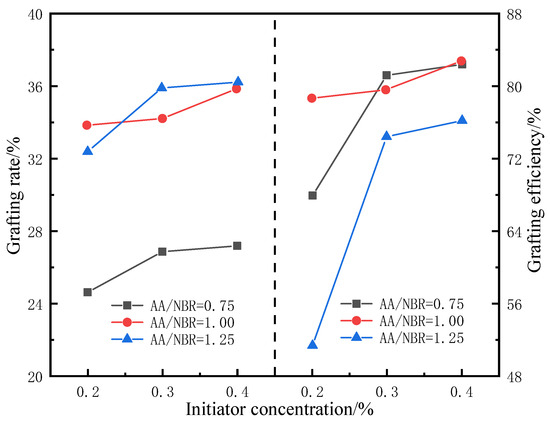 Setting the mass ratio of AA to NBR to 1 and the concentration of the initiator AIBN to 0.3% achieves the optimal grafting rate and efficiency.