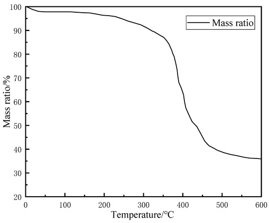 TG analysis was employed to test the gel particles’ thermal stability using a TGA400 TG analyzer (METTLER TOLEDO, Columbus, OH, USA). The sample was heated from 30 °C to 600 °C at a heating rate of 10 °C/min under a protective nitrogen flow of 100 mL/min. The change in the total mass of the gel with temperature was recorded, and a TG curve was plotted.