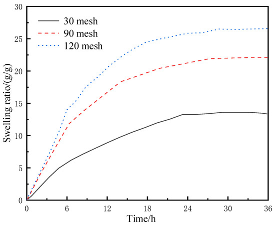 The dried resin-gel–rubber expandable LCM blend was crushed with a pulverizer and screened with different meshes to obtain LCM particles of varied sizes. The particles were placed in separate flasks containing deionized water at 60 °C, and their water-swelling ratios were tested at regular time intervals. The experimental results are shown in Figure 6.