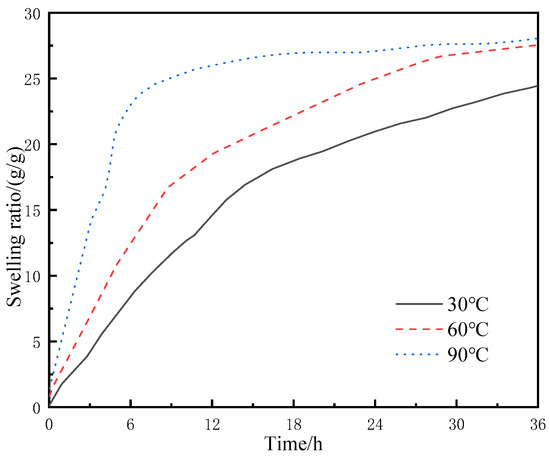 The resin-gel–rubber expandable LCM blend particles of 90 mesh were placed in flasks containing deionized water at 30, 60, and 90 °C, respectively. They were sampled at regular intervals to test the swelling ratios, and the experimental results are shown in Figure 7.
