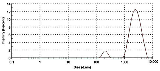 DLS was utilized to ascertain and characterize the TL-M particle sizes as well as their size distributions. Figure 1 clearly shows the presence of 2 particle fractions with sizes of ~200 nm and ~2000 nm. The DLS measured diameter was approximately 1731 nm ± 70 with a PDI of 0.337. The analysis of Microsponges’ zeta potential verified the presence of stable microsized particles, which exhibited a zeta potential of −12.13 mV. The zeta potential of a particle is a measure of both the surface charge and the stability of the particle. If the value of the zeta potential is more than 10 mV, then the particles will not cling to one another, and the system will be more stable [23,24,25].