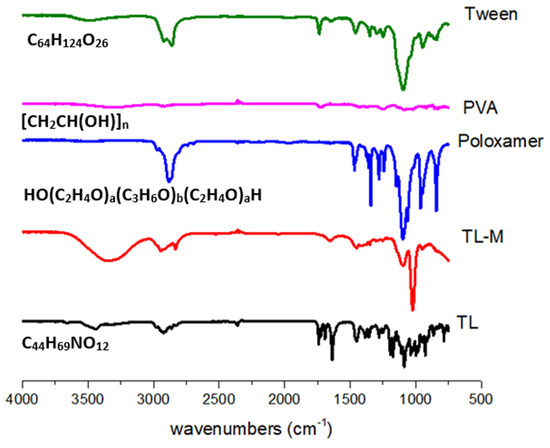 FTIR analysis of TL, TL-M, Tween 60, PVA, and poloxamer.
