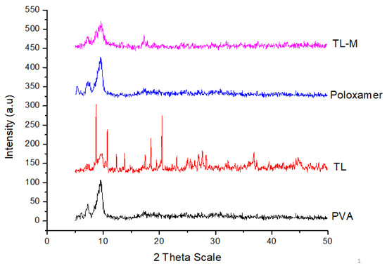 X-ray powder diffraction analysis was performed on pure TL, PVA, poloxamer, and TL-M at the Bruker facility in Ettlingen and Leipzig, Germany. The subjected radiation was cobalt-filtered ferrous ions (Fe2+) with a wavelength of 1.7890 °A [46].
