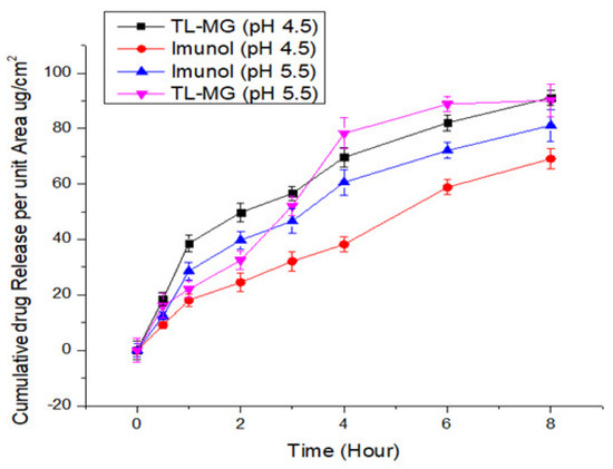 Evaluation of the transdermal permeability of pH 4.5 and 5.5 TL-MG microspheres that were manufactured to pass through a silica membrane was the major purpose of the current investigation. The receptor cell, which was clean and dried, was filled with deaerated phosphate buffer and allowed to sit in a heated magnetic block at 37 °C for 15 min. The temperature needed to be maintained at 37 °C. The prehydrated silica membrane that was used was placed in the space that was created between the matched donor compartment and the receptor compartment. One gram of TL-MG was weighed out and placed in the internal storage compartment. A parafilm covering was placed over the openings, and then they were taped shut to avoid any direct loss of moisture. When agitating the receptor compartment, a speed of 200 revolutions per minute was utilized. At a wavelength of 220 nm, HPLC analysis was performed on a final sample that was produced using a glass syringe and had a volume of 0.5 mL. A new sample of the same volume that had been warmed was brought in so that the total amount of sample that was present in the receptor compartment could be maintained at the same level. According to the findings, there was a significant amount of TL that passed through the Strat-MTM membranes at both pH levels (4.5 and 5.5), which contributed to the improved permeability of TL-MG. The comparative results from the in vitro tests showed that the TL-MG release profile was higher regardless of the pH. The results of the in vitro permeation testing showed that the formulation had the potential to lengthen the amount of time it took for the TL to be delivered compared to the commercial product Immunol (Figure 8). Based on these data, this method has great potential for use in drug delivery systems.