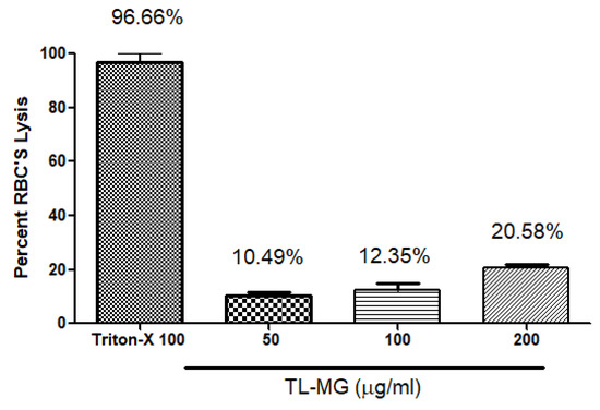 Hemolytic tests were performed to evaluate whether TL-MG was compatible with blood. The findings of the hemolytic tests (shown in Figure 9) demonstrated that TL-MG at concentrations of 50, 100, and 200 mg/mL did not result in any hemolysis being produced. Even at high concentrations, such as 200 mg/mL, there was no evidence of hemolysis, and blood cells showed a significant degree of tolerance to the complex. The findings of this investigation revealed that the concentration had an effect on the viability of the cells, and the fact that the cells survived incubation with TL-MG provided evidence that it is compatible with blood. Figure 9 shows the maximum blood hemolysis percentage against 50, 100, and 200 mg/mL (10.49 ± 2.1, 12.35 ± 3.8, and 20.58 ± 5.2%).