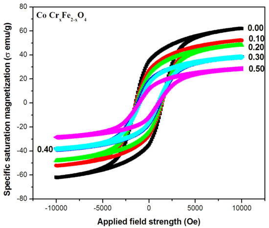 Figure 2 depicts magnetic hysteresis loops for a series of CoCrxFe2−xO4 samples with different values of x, ranging from 0.00 to 0.5 in 0.1 increments at ambient temperature. All samples show a soft ferrimagnetic character with low coercivities.
