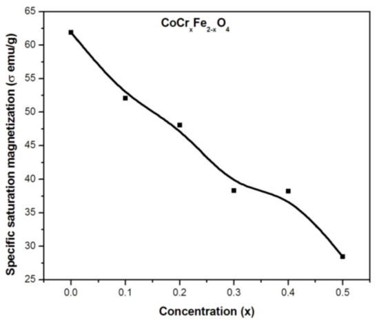 In addition, saturation magnetization (Ms) and coercivity (Hc) data were collected from the corresponding M-H curves for each sample. The change in Ms as a function of Cr ion substitution is shown in Figure 3. The observed changes in coercivities with changing substituent concentration are discussed in detail below.