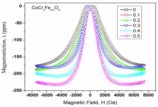 Magnetostriction curves as a function of magnetic field for CoCrxFe2−xO4.