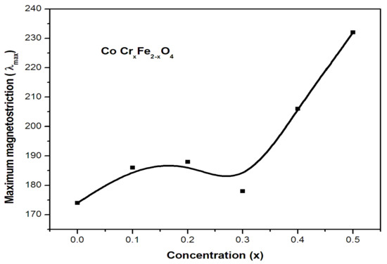 Figure 4 depicts magnetostriction curves with respect to applied magnetic field in a series of samples. These plots have been used to estimate the maximum magnetostriction and strain derivative values. Figure 5 depicts the differences in highest magnetostriction as a dependent of substituent concentration for ferrite samples. In the CoCrxFe2−xO4 systems, the maximal magnetostriction increases moderately with chromium content at lower concentrations, but it increases significantly at higher concentration values.