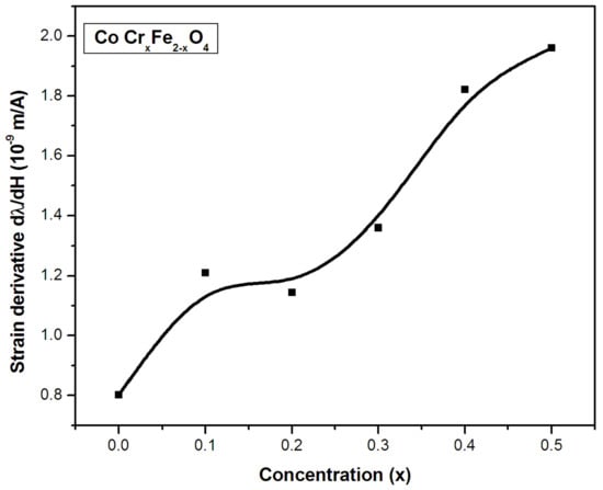 Figure 6 depicts the variations in the magnetostrictive strain derivative () as a function of the substituent concentration for a series of ferrite samples. The strain derivative in the Co-Cr ferrite system increased with the chromium content across the whole range of substitutions in the CoCrxFe2−xO4 systems. Therefore, this implies that the chromium-substituted system exhibited an increasing trend in the range of concentration from x = 0 to 0.1, and, thereafter, a decrease is marked at higher concentrations of chromium.