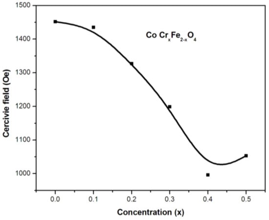Figure 7 shows the relationship between coercivity and the chromium (Cr) concentration in a series of samples within the CoCrxFe2−xO4 system. It is noted that there is an exception at the x = 0.5 concentration, where a progressive decline was observed. On the other hand, the magnitude of the gradient from the lowest chromium-substituted cobalt ferrite (x = 0.0) to the basic cobalt ferrite (x = 0.0) is relatively constant, suggesting that the anisotropic and microstructural changes responsible for the coercivity variations in the substituted ferrite systems are similar.