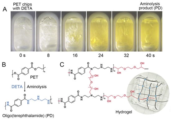 - Chan, K.; Zinchenko, A. Conversion of waste bottles’ PET to a hydrogel adsorbent via PET aminolysis. J. Environ. Chem. Eng. 2021, 9, 106129. [Google Scholar] [CrossRef]
