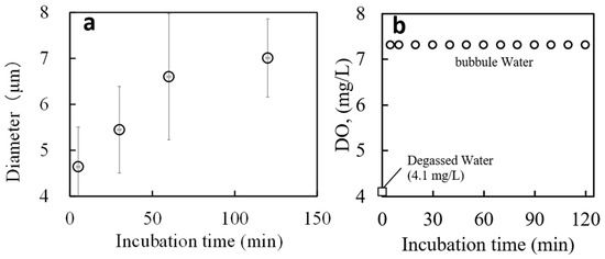Figure 1a shows the bubble size in the bubble waters measured by the DLS measurement plotted against the incubation time after the bubbles were generated. The average bubble size increased from 4.5 µm to 7 µm over 2 h. The stability of the bubbles is maintained due to the solubility effect and their high internal pressure [43]. Various factors, including generation methods, measurement techniques, and the purity, temperature, and pressure of the water used, influence the lifetime and stability of the micro-nano bubbles. Consequently, it is challenging to provide a general duration for their nanosized persistence in pure water [35,43]. For a single bubble with an initial radius of 200 nm, the estimated lifetime ranges from 10 to 100 s. Bubbles bigger than nanometers tend to have shorter lifetimes than micro-nano bubbles in pure water [44,45,46,47]. This is due to the pressure acting on the surface of the bubble and the tendency of the gas inside the bubble to dissolve in water. Since the bubble water used in our experiment was prepared from pure water and was relatively large and micronized, coarsening is expected to have progressed within this time frame.