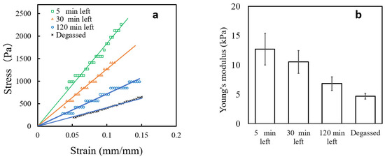 Figure 2a shows the linear sections of the stress–strain curves of gels prepared with degassed water or bubbled water left for different aging times. The gel obtained from degassed water has the lowest Young’s modulus at 4.7 kPa, making it the softest sample. Conversely, the gel obtained from 5-min aged bubble water has the highest Young’s modulus at 12.7 kPa. These results indicate that bubble water significantly affects the mechanical properties of the gels. Gels made with bubble water with longer aging times are softer, which could be related to the size of the bubbles, and will be discussed in Section 2.3.