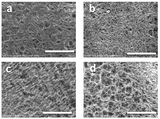 Figure 3 shows SEM images illustrating the surface morphology of aerogels prepared using bubble water as a solvent followed by freeze-drying. A comparative analysis between aerogels synthesized with bubble water and those using degassed water reveals distinct differences in surface topography. In particular, aerogels formed with bubble water exhibit a significantly rougher surface characterized by a sponge-like morphology. This textured surface is commonly observed in aerogels prepared by freeze-drying hydrogels and is attributed to the formation of ice nuclei during the freezing phase of the hydrogel [55,56]. The intricate dimensions and characteristics of the surface textures are closely related to the parameters of the freezing and freeze-drying processes employed. While SEM analysis revealed a correlation between increased pore size and the aging time of bubble water, definitive evidence linking these features to the residual bubbles is lacking. We postulate that cavities and voids within the matrix may act as central ice nucleation sites during the freezing process, thereby influencing the surface morphology of the aerogel. SEM analysis suggests that bubble formation in the solvent during the polymerization phase induces significant changes in the microstructure of the resulting gel. The apparent porous architecture shown in this figure plays a critical role in facilitating the expulsion and subsequent absorption of water necessary for gel deformation. In particular, this has implications for the deformation rate during volume transitions. However, additional studies are required to understand the mechanistic basis fully.