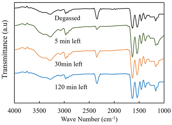 Figure 4 shows the FT-IR spectra of dried PNIPAM-co-AAc gels prepared with bubbled water left for the given minute and with degassed water. Unique absorption bands were observed in all samples analyzed at about 1650 cm−1 and 1530 cm−1. These bands are attributed to the C=O stretching vibrations inherent in amide linkages and the N-H bending vibrations, respectively. Such spectral features confirm the successful polymerization of PNIPAM and the formation of amide bonds. In addition, an absorption peak near 1700 cm−1 can be attributed to PNIPAM and the C=O stretching vibrations of the co-polymerized AAc monomer. This comparative spectral analysis concludes that the presence or absence of bubbles during gelation has little impact on the chemical composition of gels.