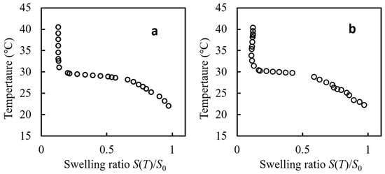 Swelling ratio S(T)/S0 of PNIPAm-co-AAm hydrogels plotted as a function of temperature. Hydrogels were synthesized using (a) degassed water and (b) bubble water left for 120 min.